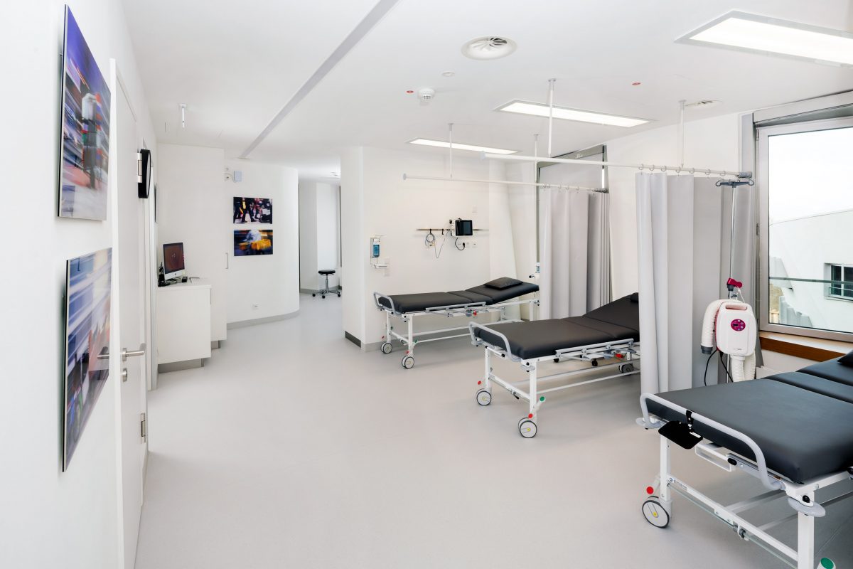 With attention to detail and consideration for the fluid façade and the special room layout, Kinzel Architecture designed a unique concept that blends in with the special architecture. At the same time, great importance was attached to the quality and variety of materials that meet the requirements of fire protection and the conditions of a clinic.