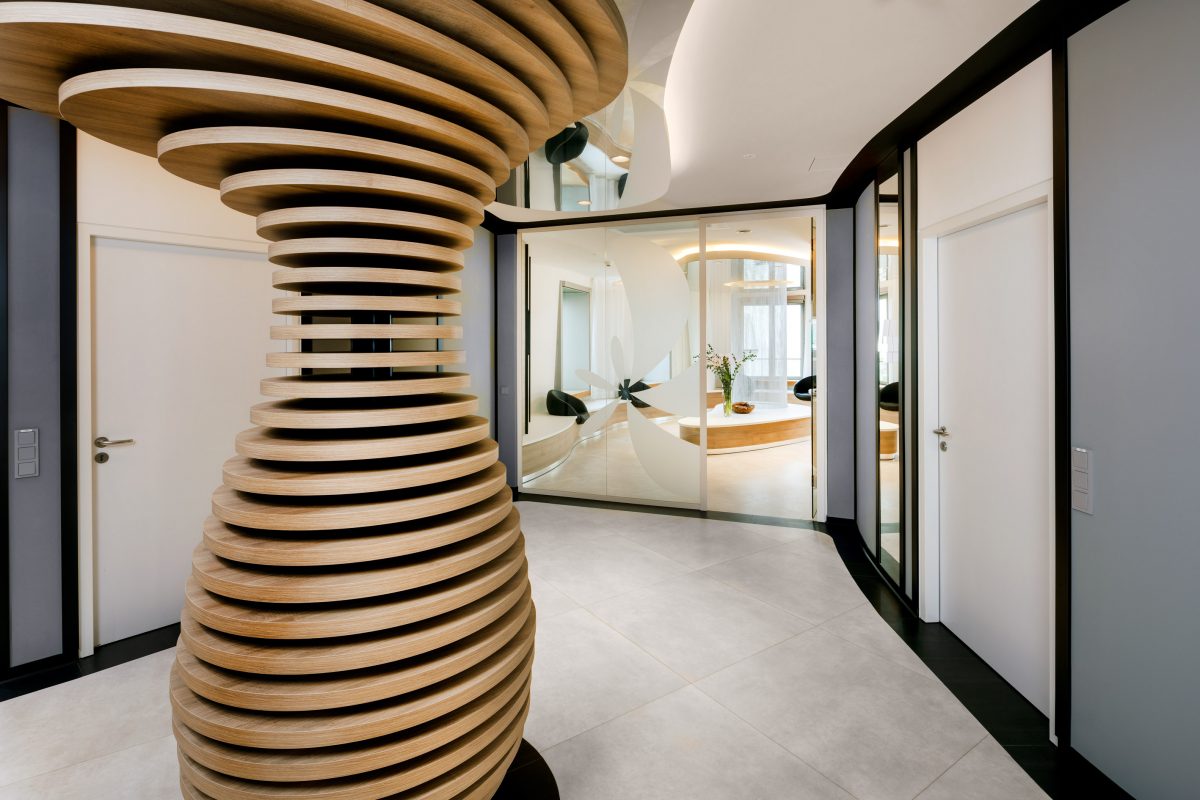Das Büro Kinzel Architecture entwickelte im Zuge des Umbaus der Plastmed Privatlklinik ein mutiges Konzept, das die Hülle der Gehry-Bauten respektiert und zugleich maßgeschneiderte Räume für den Klinikalltag schafft. Die organischen Formen der Architektur wurden zu Leitlinien für die neue Raumstruktur.