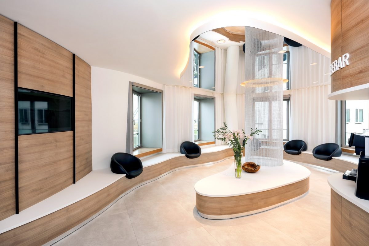 Neben dem großzügigen Empfang mit elegantem Welcome Desk, vereinen alle Klinikbereiche Offenheit und Rückzug. Die Flure, Patientenzimmer sowie Behandlungsräume sind von individuellem Tageslicht geprägt – Organische Formen, Licht und Raum werden Teil des Heilungserlebnisses.